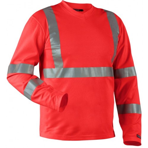 Pitkähihainen huomiovärinen t-paita v-kauluksella. Antibakteerinen materiaali, joka on normaalia helpompi pitää puhtaana ja hajuttomana. Suojaa auringon haitalliselta UV-säteilyltä, aurinkosuojakerroin on 40+. Heijastimet on kiinnitetty painamalla. Sertifioitu EN ISO 20471 ja EN13758-2 UPF 40+. Väri 5500 punainen 44,50€.
